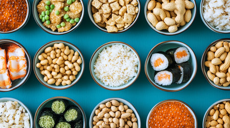 Colorful display of various Asian snacks and sushi on a turquoise background arranged in small bowls