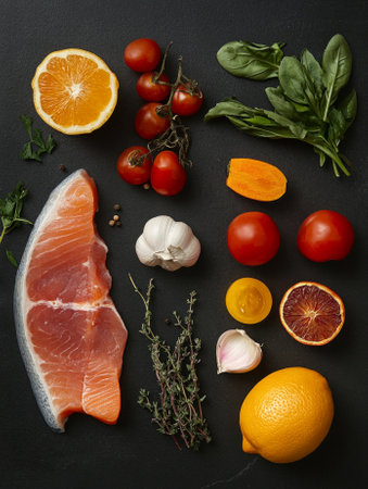 Fresh ingredients for healthy cooking with salmon, tomatoes, garlic, and citrus on dark background.