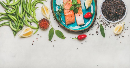 Flat-lay of Raw salmon fish fillet steaks with vegetables, greens, rice, spices and lemon in blue plate over grey marble background, copy space, top view. Clean eating, dieting, power boosting concept