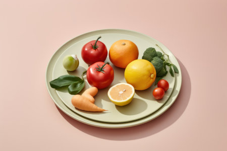 A plate of fruit and vegetables on a pink surface. Generative AI image.