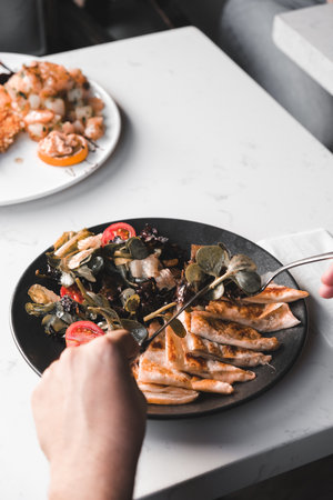 Macro picture of a tasty dish in a blue plate on a white table background. Hand are cutting a piece of juicy meat. Copy space.