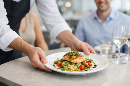 A Close-up of the Waiter's Hand Delivering a Plate of Food in a Restaurant Setting