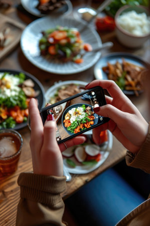Overhead top view of a person taking a photo of their food with a phone for social media