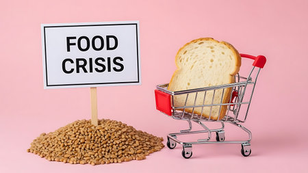 A symbolic representation of food crisis with a shopping cart containing bread, a sign, and grains on pink.