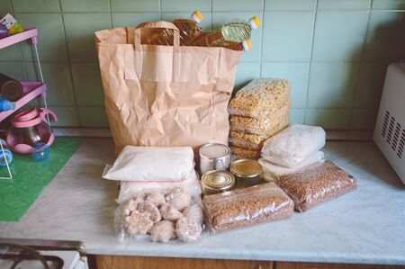 Volunteer donation various product set for poor or elderly people. Pandemic coronavirus food shortages. Food donations or delivery concept on kitchen background.