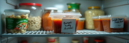 Budget-friendly meal prep containers in refrigerator with healthy snack options. That the image is generated using AI.