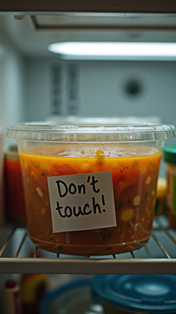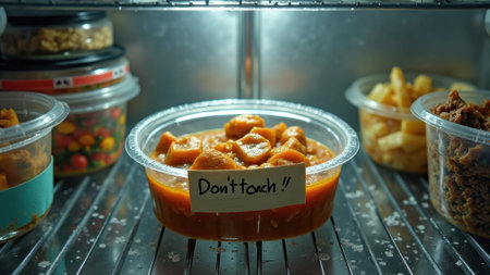 Labeled container in refrigerator with don't touch note. That the image is generated using AI.