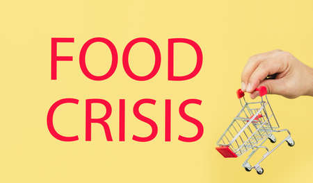 Man holding small empty shopping cart. Words FOOD CRISIS on yellow background. food shortage concept