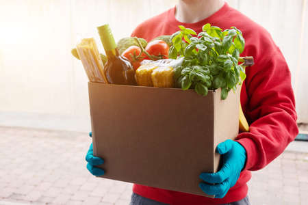 Food delivery, donation, assistance during quarantine. A male delivery man in a red sweater is holding a cardboard box with groceries.