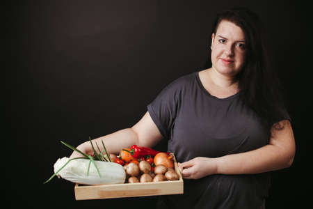 Woman holding box with vegetables and mushrooms