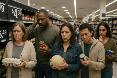 People in a grocery store showing concern over rising prices, reflecting economic crisis, inflation, and social impact
