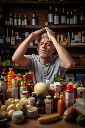 Man holding his forehead while having headache due to higher food prices from inflation.Rising food and grocery store prices and expensive daily consumer goods concept. The problem of inflation. High quality photo