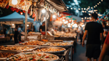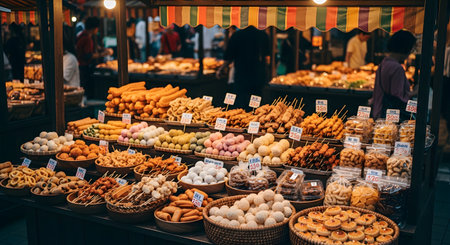 Street food for tourists, vibrant stalls offering diverse, delicious, and exotic flavors