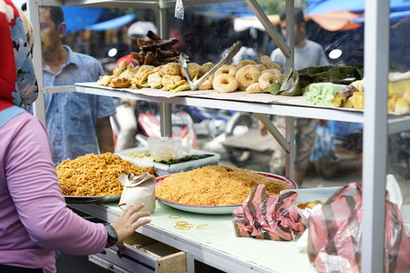 Banda Aceh, Indonesia - May 22, 2018: Muslim shoppers buying food from street vendor for breaking fast or iftar in Banda Aceh