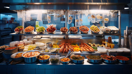 Street market vendors selling grilled seafood and vegetarian food buffet generated by artificial intelligence
