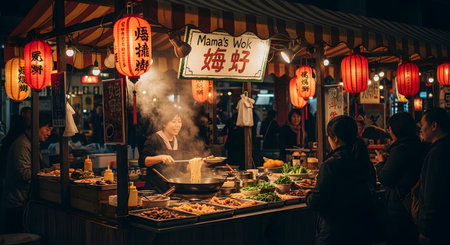 A bustling Asian street food stall is alive with activity at night, as vendors skillfully cook noodles in a large, steaming wok and tend to grilled skewers. The warm, inviting light from the stall illuminates the rising steam, creating a vibrant and atmospheric scene of delicious, authentic, on-the-go cuisine.