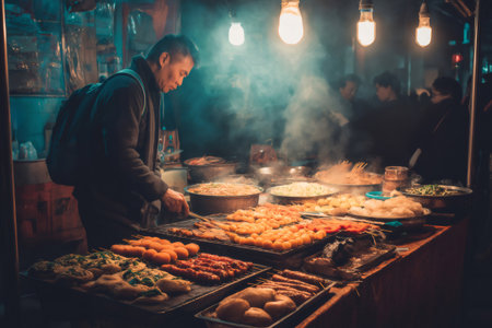 Chinese street food vendor cooking traditional dishes on a barbecue at a night market, illuminated by warm lights