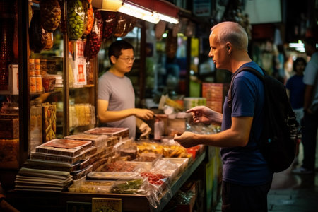 a man buys groceries at a counter in Asia.