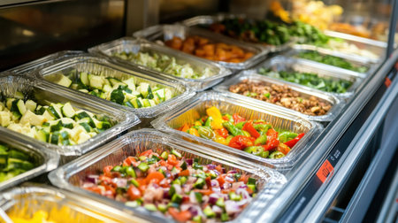 A vibrant display of fresh chopped vegetables and ingredients arranged in silver foil containers, perfect for catering and restaurant settings.