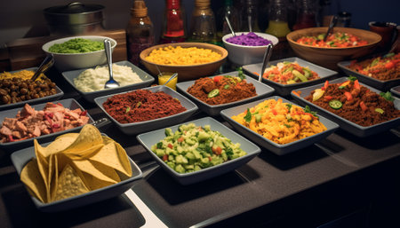 burrito bar, with different fillings and toppings on display, created with generative ai