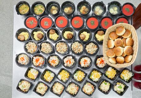 Food delivery. Lunch in the office. Different in plastic disposable lunch box with healthy natural food. Chicken broth, mashed soup, mashed potatoes with cutlet, seafood pasta, salads, pilaf with a fresh bun.