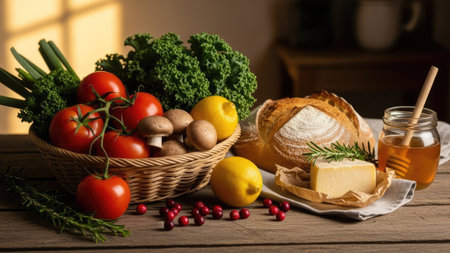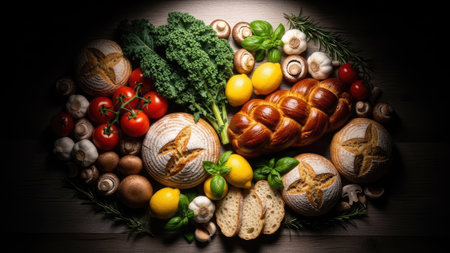 An assortment of fresh produce and baked goods is artfully arranged. The composition features various bread types, tomatoes, mushrooms, leafy greens, and lemons. The image utilizes dramatic lighting, with a focus on textures and colors. Suitable for culinary, health, or lifestyle-related editorial content.