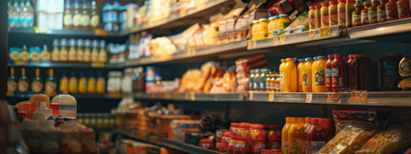 Supermarket shelves filled with a variety of products, captured under warm and inviting lighting. The well-organized display highlights the abundance and diversity of goods available.