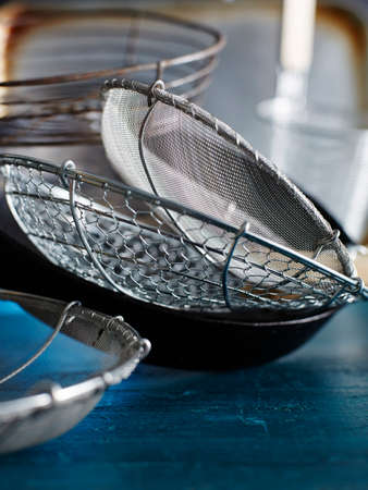 Stainless steel kitchen sieves together. Image of strainer. Kitchenware shop