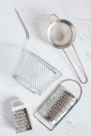 metal kitchen accessories. kitchen utensils grater, strainer and basket for fries