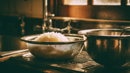 A serene kitchen scene capturing freshly cooked rice in a strainer over a stainless steel sink, highlighting the culinary process and home cooking warmth.