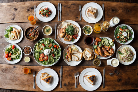 An inviting dining setup showcasing a variety of dishes on a wooden table. Vibrant colors and generous portions create a warm, communal dining experience.