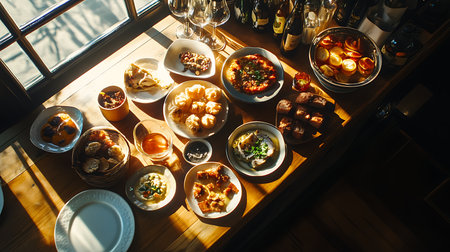 An inviting aerial view of a beautifully arranged dinner table showcasing an array of delicious dishes, fresh flowers, and elegant tableware, perfect for gatherings.
