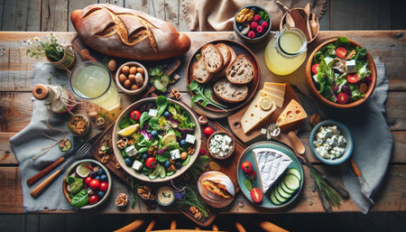 Professional top-down view of a rustic farm-to-table spread, featuring farm-fresh salad, artisan bread, a cheese platter, and homemade lemonade, presented on a wooden table with rustic tableware