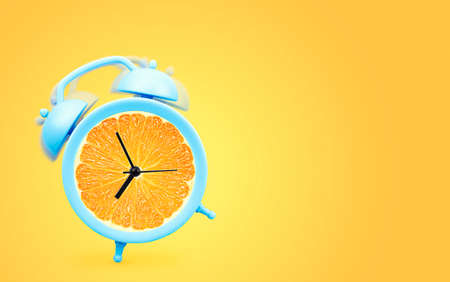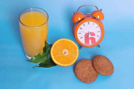 Closeup of an orange alarm clock with a glass of orange juice, fresh ripe fruit cut in half, oatmeal cookies on a blue background. Organic and healthy breakfast concept.