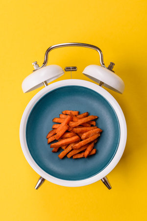 Sweet potato fries fried in oil, food to go. Concept time to eat with a plate on a vintage alarm clock scoreboard