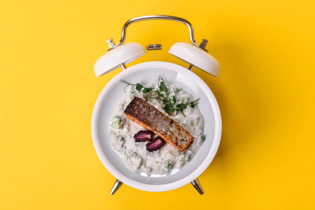 Top view of vegetables and fruit in heart shape plate with white vintage alarm clock, eggs and pink bottle of water on yellow background. healthy lifestyle and intermitten fasting concept.