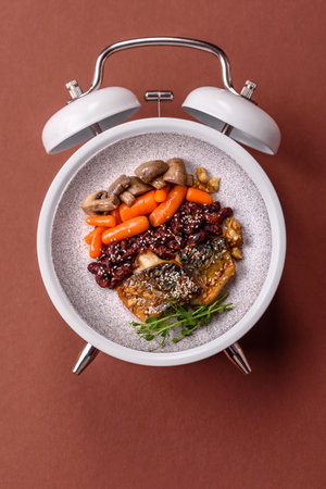 breakfast time, alarm clock and healthy and balanced breakfast