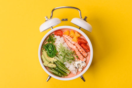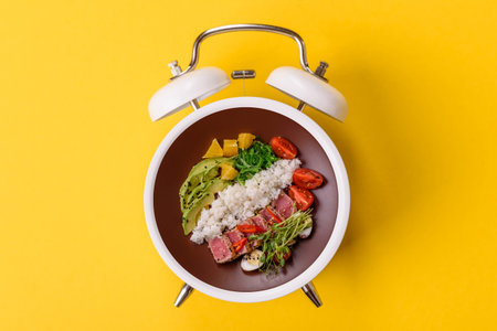 Vegetarian salad or bowls with quinoa, vegetables on a vintage alarm clock background. Conceptual background time to eat vegetarian food