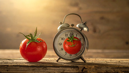Pomodoro kitchen timer in form of a red tomato laying on a wooden table , with colorful objects around