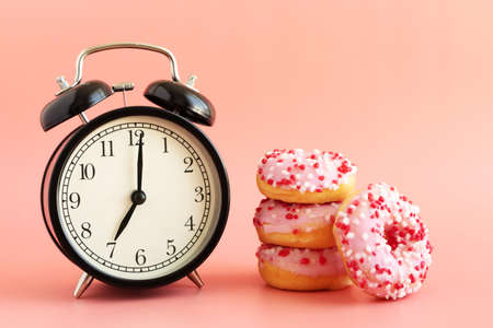 carrot cake with a alarm clock a concept to remind people when to start and not eat junk sugar foods backlit with a white window in the background