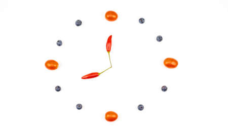 A clock from cherry tomatoes, blueberries and red chillies on a white background showing the time. Space for text.