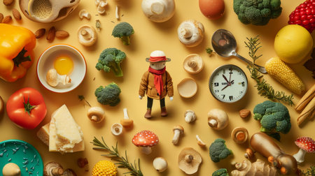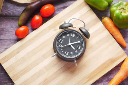 fresh vegetables and alarm clock on a chopping board on table