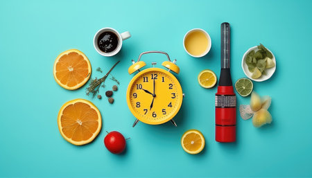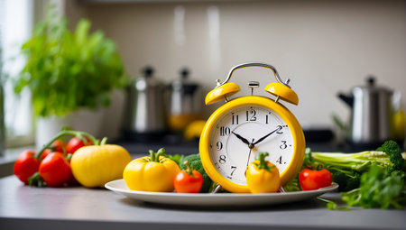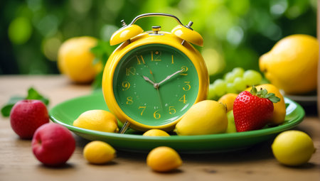 vintage alarm clock and fresh fruit on kitchen table intermittent fasting