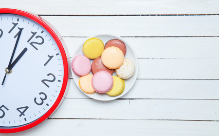 Clock and macaron with christmas toys.