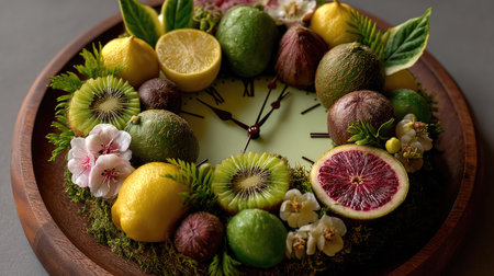 Food clock at lunch time. Healthy food concept on wooden table