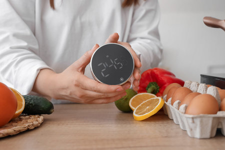 Woman with modern kitchen timer at table in room, closeup