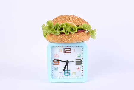 Burger and clock on white background. Diet concept