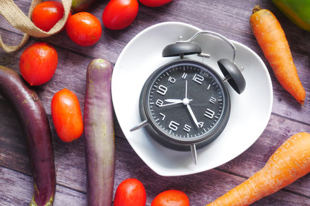 fresh vegetables and alarm clock on heart shape plate on table