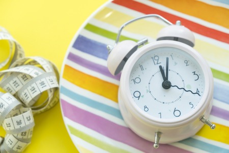concept of intermittent fasting, ketogenic diet, weight loss. alarmclock on plate