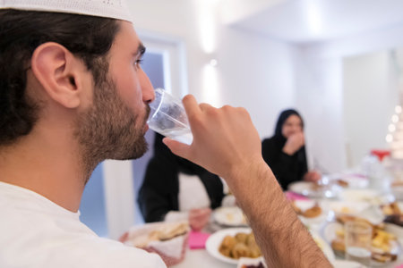 Muslim family making iftar dua to break fasting during Ramadan.
